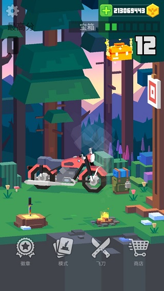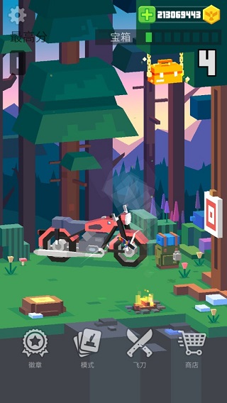 飞刀大师(Flippy Knife)是由全球知名休闲游戏厂商Beresnev Games倾力打造的硬核物理系动作闯关神作。以真实重力、旋转惯性与抛物线轨迹为核心,它用极简的像素美学包裹深邃的操作逻辑——每一次拔刀、甩臂、腾空、落刃,都在挑战你对力度、角度与时机的肌肉记忆。游戏融合收集养成、多维关卡与精准操作于一体,既有匕首、军刀、战斧、光剑等102把风格迥异的飞刀可供解锁,也覆盖露营地、森林小屋、悬崖树梢、草地木桩等数十种沉浸式场景。这不是一款“点一下就赢”的小游戏,而是一场关于平衡、节奏与手感的指尖修行。
