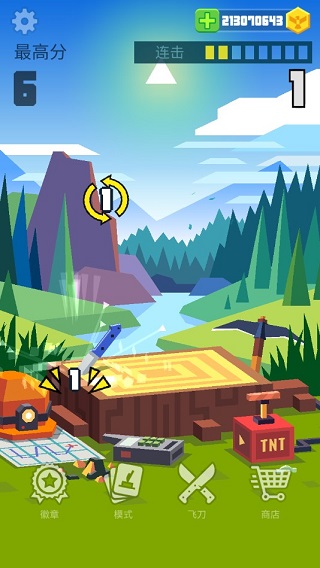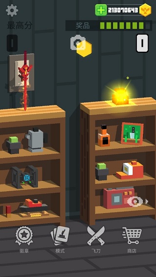 飞刀大师精心设计了四种差异化模式,各具机制深度与成长路径:连击模式是新手入门与高手精修的必经之地——竖插树桩→拉拽刀身→释放旋转→刀尖朝下稳立,连续成功可触发金币冲刺;打靶模式考验预判与微操,远距握柄控速、近距握刀增旋,十连中靶即开宝箱;攀爬模式以双墙为支点,借刀跃升,长刀稳扎、短刀巧算,无人机金币缓缓领航;过关模式则化身室内跑酷,跃过沙发、茶几、书架等高低错落的家具障碍,短刀灵巧、长刀易绊,八连跃即获丰厚奖励。
