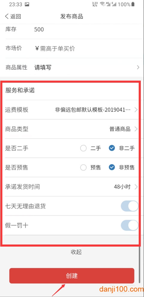 在【服务承诺】模块勾选适用保障项(如“假一赔十”“送货上门”等),点击【发布】按钮;