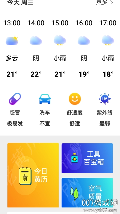 · 全面覆盖紫外线、运动、洗车、穿衣、感冒、过敏等12类生活指数评估;