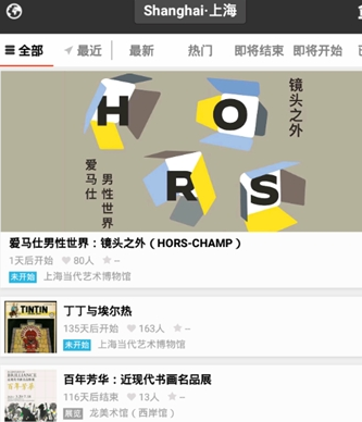 3、切换至「同城」页面,聚焦中国境内正在展出的文物珍品、当代艺术项目与非遗特展;
