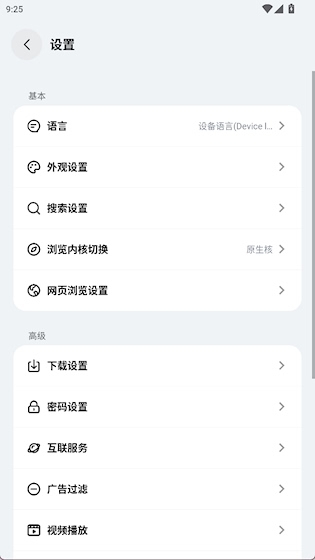 设置中心提供全面配置支持,包括语言切换、主题选择、默认搜索引擎设定等个性化选项。