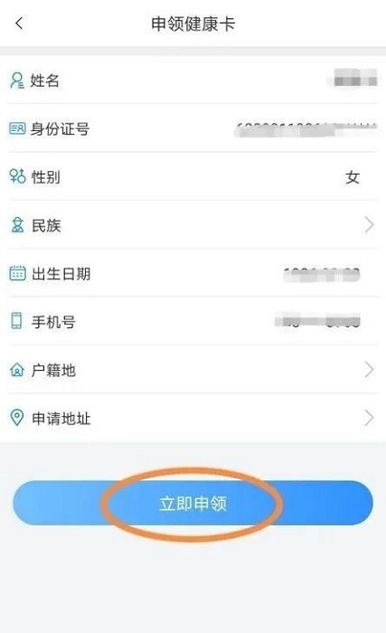 第四步:如实填写姓名、身份证号、手机号、常住地址等基本信息,确认无误后点击【立即申领】;