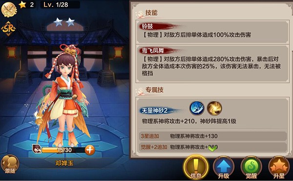 邓婵玉与广成子:均具备优秀单体输出能力,前者暴击后可转为群体打击,后者锁定怒气最高目标并施加怒气压制,专属技专注强化物理系武将;