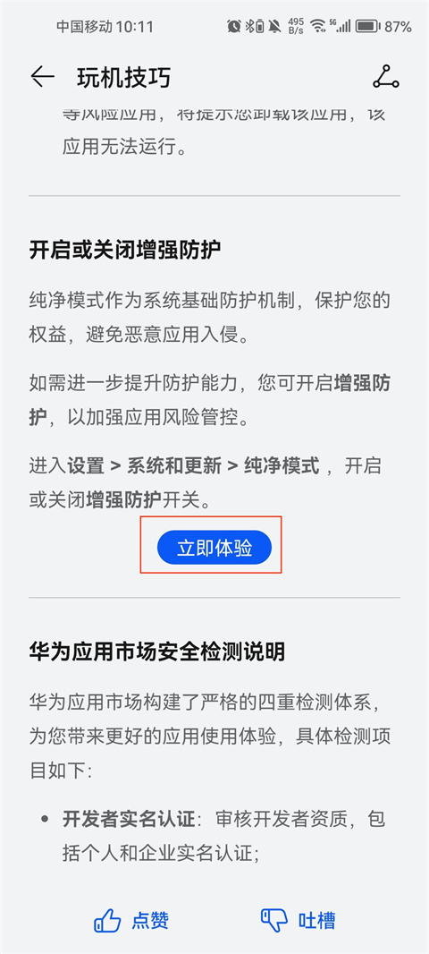 2、页面自动跳转至【玩机技巧】,下滑找到【立即体验】并点击进入;