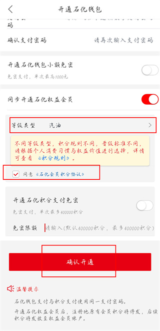 选择常用油品类型(如92#、95#汽油或柴油),勾选协议,点击【确认开通】完成激活。