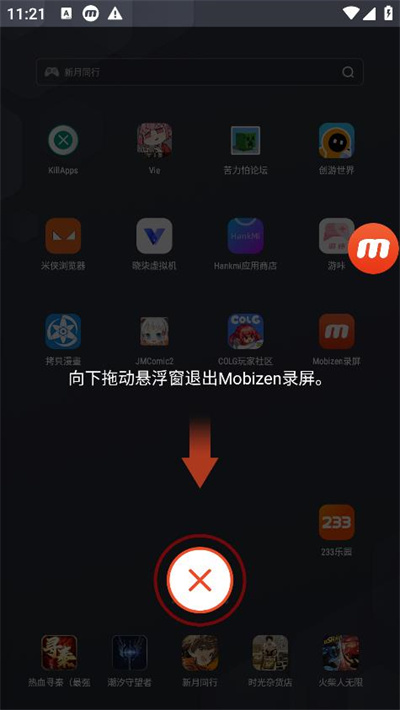 3. 录制完成后,只需将悬浮窗拖动至屏幕底部的【X】图标处,即可一键停止并退出录屏界面,操作便捷高效。