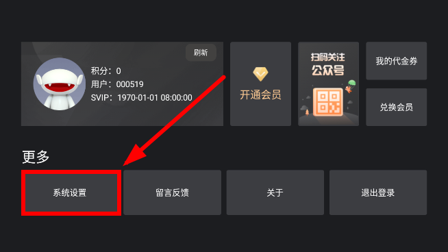 在夜神TV中,用户可灵活导入自定义数据源,实现个性化内容聚合。首先,在“我的”界面底部找到“更多”板块,点击进入“系统设置”。