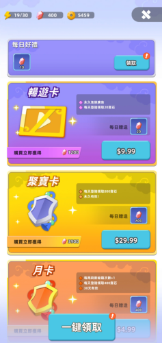 未购买特权时,每日可免费领取10枚宝石;购买畅游卡、聚宝卡或月卡后,每日登录可稳定获得数百宝石。