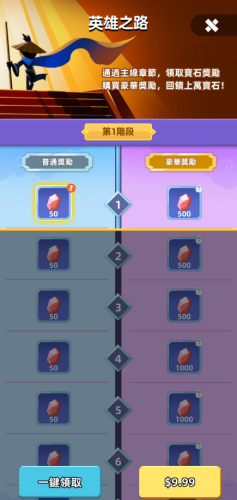 推进主线章节可直接领取宝石;解锁豪华奖励后,还能额外获得大量宝石,性价比突出。
