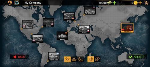 - 可在全球多地地图中选择任务区域,包括上海、迪拜、旧金山、布宜诺斯艾利斯等,并自定义时间(清晨、黄昏)与天气(晴、雨、雪);