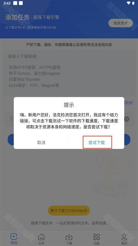 1、首次打开应用时,系统会提供一个测试磁力链接,点击右下角“尝试下载”即可开始体验。