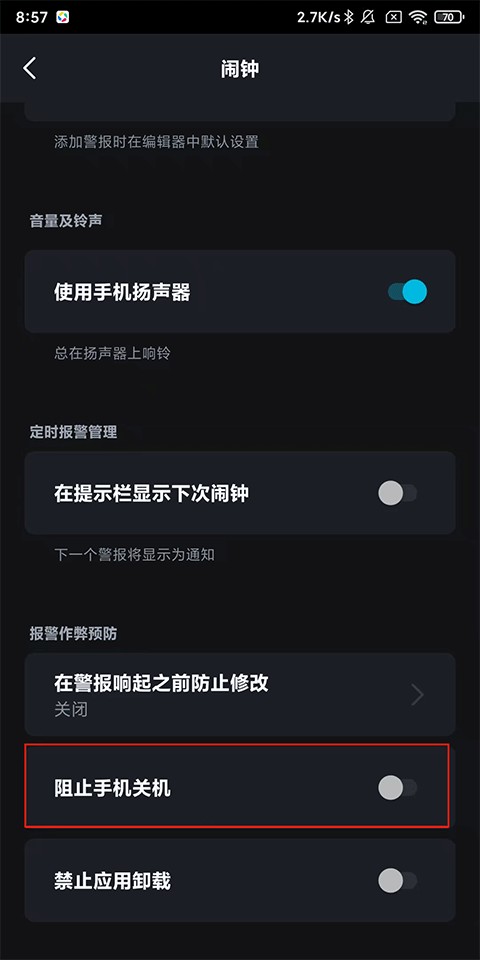 3、找到【阻止手机关机】选项,并开启右侧开关。启用后,即使尝试关机,闹钟仍会在重启后继续响铃,直至完成指定任务。