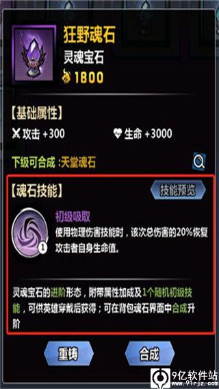 在装备界面中,除常规装备外,还设有“魂石”系统。所有达到100级的英雄均可自由装备魂石,每位英雄最多佩戴两枚。魂石不仅提供基础属性,从紫色品质(狂野魂石)起还将附带技能效果,合理搭配可显著提升战力,甚至实现以弱胜强。