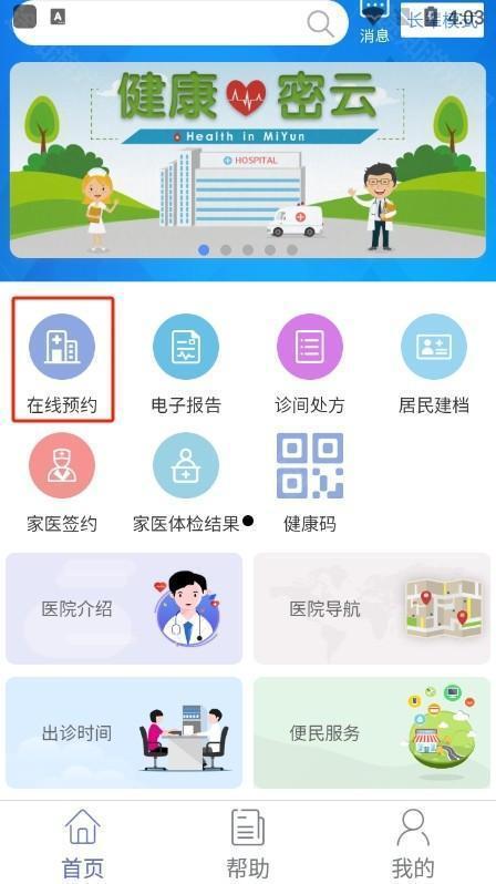 1、安装并打开健康密云最新版后,点击首页【在线预约】入口;