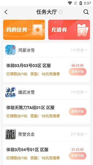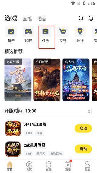 - 打开应用首页,顶部导航栏包含“新游”“找服”“任务”“交易”“排行”等功能模块,点击“任务”进入任务大厅;
