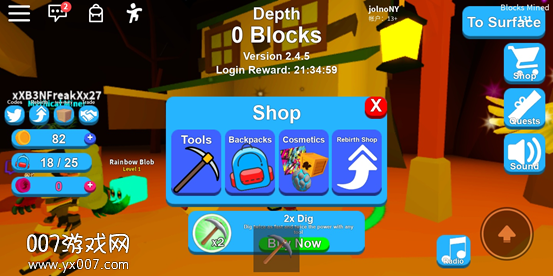 当拥有一定数量的金币后,我们可以去找标有购买标识的商人购物!进入黄色圈圈后,会弹出商店界面,共有四个分类,分别是工具、背包、装扮(可以购买一些发型、宠物等)和重生商店(可以购买一些道具)。前期主要是购买更高级的工具和背包,这样就不用频繁回到地面,提高挖矿(赚钱)的效率~拥有高级的道具后,我们就能逐渐深入更下层的地里挖矿,能挖到更好的东西,运气好的话能挖到金箱子、钻石等,但对应的,需要的挖矿工具级别会很高!