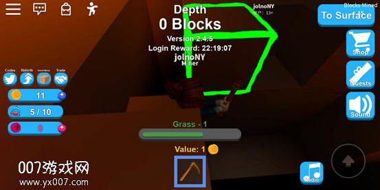 首先我们要去矿场,然后点击屏幕正下方的木镐将其装备上,然后点击要挖的矿,这时候矿就会出现绿色的框框,按住它就能开始挖啦!选择目标后我们就能看见目前的矿值多少钱,最开始我们只能挖价值1金币的矿,一次只能装满10个矿,价值10金币。