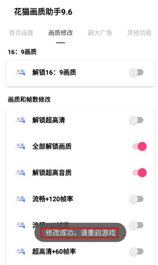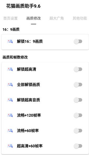 2、点击画质修改,玩家们可使用解锁16:9画质、解锁超高清、全部解锁画质、解锁超高音质、流畅+120+60帧率、超高清+60帧率等功能。