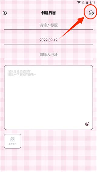 2、创建日志,填写标题、时间、地址、内容和照片。