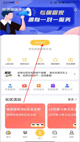 1、进入安居公社App首页,点击“添加房产”按钮,开始绑定流程。
