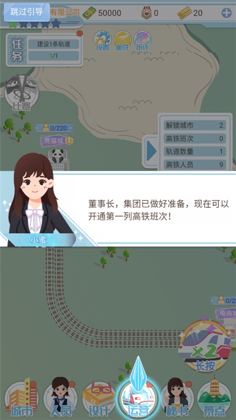 模拟高铁集团游戏是一款模拟经营类游戏,玩家将扮演高铁集团CEO,负责建设与运营高铁线路及车站,包括开通城际轨道、设计高铁列车、处理突发紧急事件等。操作简单,需合理规划站点布局,提升乘客满意度,打造舒适高效的高铁网络!