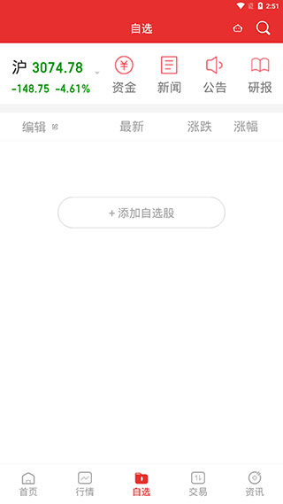 3、如果用户想要添加自选股,可以来到【自选】页面进行操作,而且你还可以查看具体的资金、新闻、公告和研报。