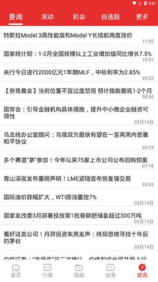 5、【资讯】页面为用户展示的都是证券方面的新闻内容,这些内容也细分为了要闻、滚动、机会、自选股等不同板块。
