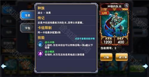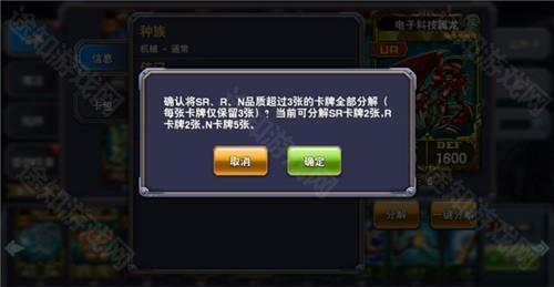使用【一键分解】功能,可自动将卡组中N、R、SR品质且数量超过3张的卡牌批量分解(每种保留3张),高效清理冗余库存。