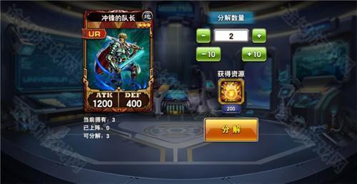 例如分解一张“冲锋的队长”(R级),可获得200单位荒魂。卡牌稀有度越高(如SR、SSR),分解返还资源越多。