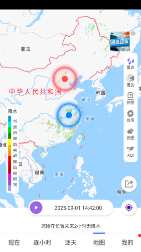 3. 进入“天气地图”模块,可通过动态图层直观了解降雨、台风、闪电等天气系统的实时分布与移动趋势。