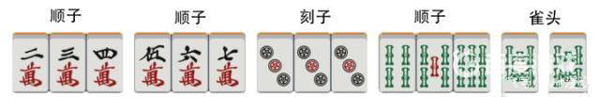 • 平和(门前清限定):全顺子结构,雀头非役牌,且为两面听