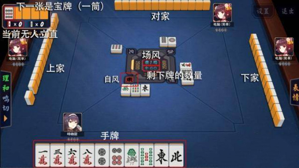 2、标准对局为四人参与,每人初始手牌13张,按逆时针顺序轮流摸一张牌并打出一张。玩家通过“吃”“碰”“杠”等操作调整手牌结构,最终组合成四组顺子或刻子 + 一对雀头,满足胡牌条件即可获胜。