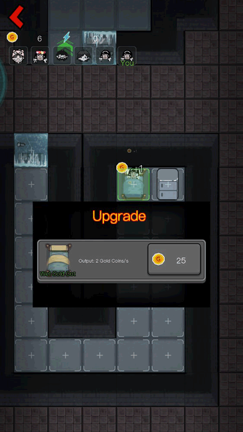 - 床铺达每秒64金币后,立即建造4个维修台(数量拉满),并补充2座铜矿加速金币获取。根据猛鬼强度适时增建或升级炮台,房门继续升至钢门四级或五级。