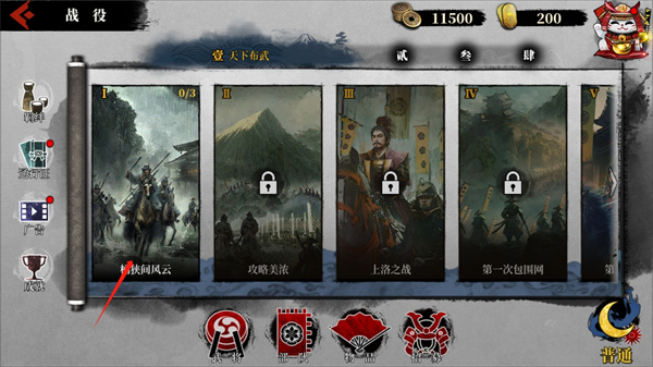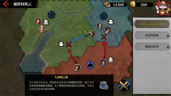 游戏涵盖16个章节、超过200场经典战事,如“桶狭间风云”“攻略美浓”“天下布武”等,深度还原日本战国时代的恢弘史诗。