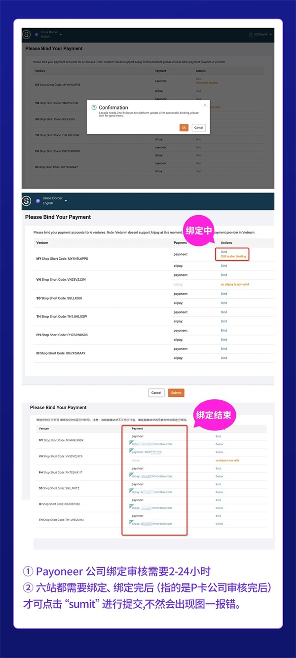 A8:首次入驻需绑定六国。除越南(VN)必须使用Payoneer外,其余五国可选择Alipay或Payoneer。