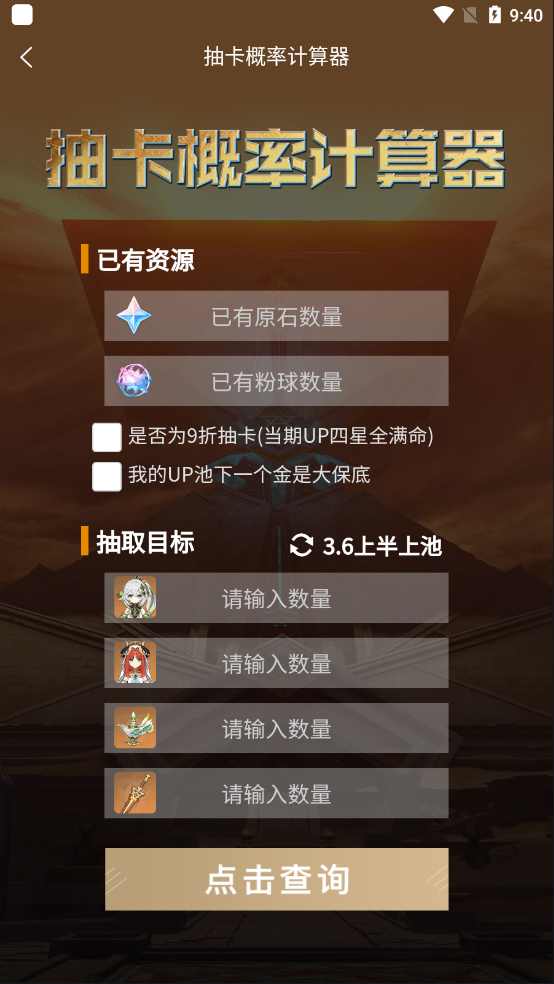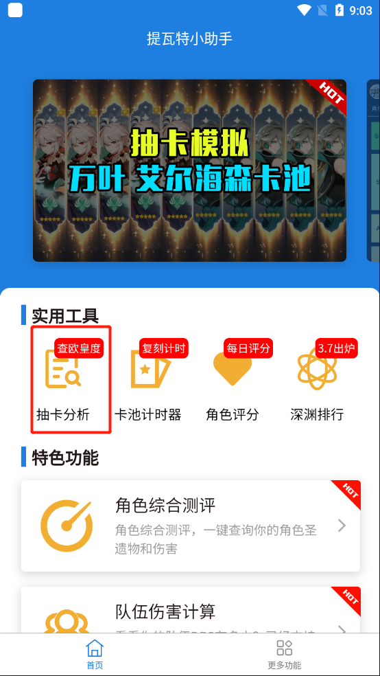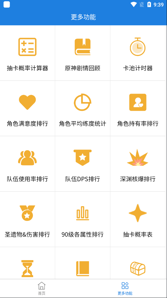 在“更多功能”中找到【抽卡概率计算器】,填写当前拥有的原石数量、纠缠之缘(粉球)等资源,系统将智能计算你获得心仪五星角色或武器的成功概率,辅助规划抽卡策略。
