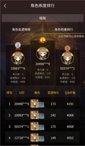 在首页底部选择“角色伤害查询”,输入你的《原神》游戏UID并点击绑定,即可同步角色数据,查看全服或分区内的伤害排行榜,评估角色强度与配装水平。