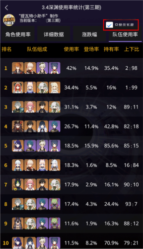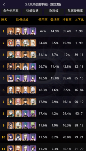 支持手动输入或截图上传圣遗物信息,自动评分并给出优化建议;同时提供“队伍使用率排行”,可按全角色、仅五星等条件筛选当前版本强势配队,助你紧跟环境潮流。