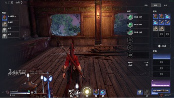 1. **物品拾取与管理**:按E键直接拾取地面物品;或按TAB打开物品栏,通过拖拽完成拾取与更换。物品栏分为武器栏、魂玉栏、道具栏三类,各有格子限制,拾取扩展背包可自动解锁额外空间。护甲单独占用一格。