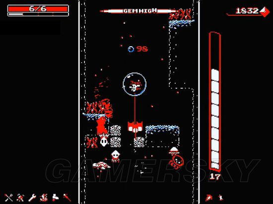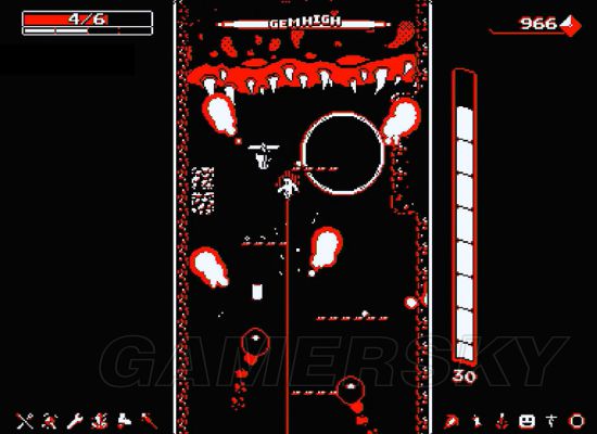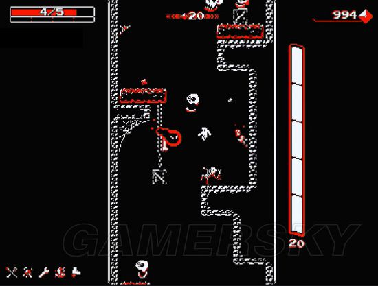 游戏的核心围绕“下坠”与“反击”展开。玩家在深井中持续下落,途中会遭遇青蛙、小骷髅、幽灵、红球等多种敌人。而你的主要装备——枪鞋,既是武器,也是移动辅助工具。