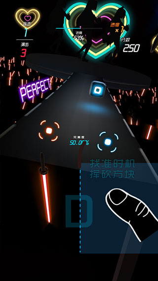 3. 以精准时机挥砍是关键——如图所示,对准蓝色方块果断出击,即可达成“完美”判定。