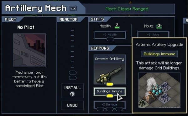 面对怪兽攻击建筑的危局,近战机甲虽能击杀敌人,却可能将其推入建筑造成附带伤害。最有效的解法是为“炮兵机甲”(Artillery Mech)装配“对建筑零伤害”(Building Immune)特性。此应作为早期“能力核心”的首要投资方向。