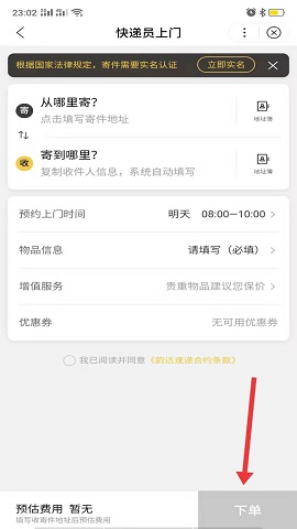 4. 填写寄件人、收件人及物品信息,确认无误后点击“下单”,系统将安排快递员按时上门取件。