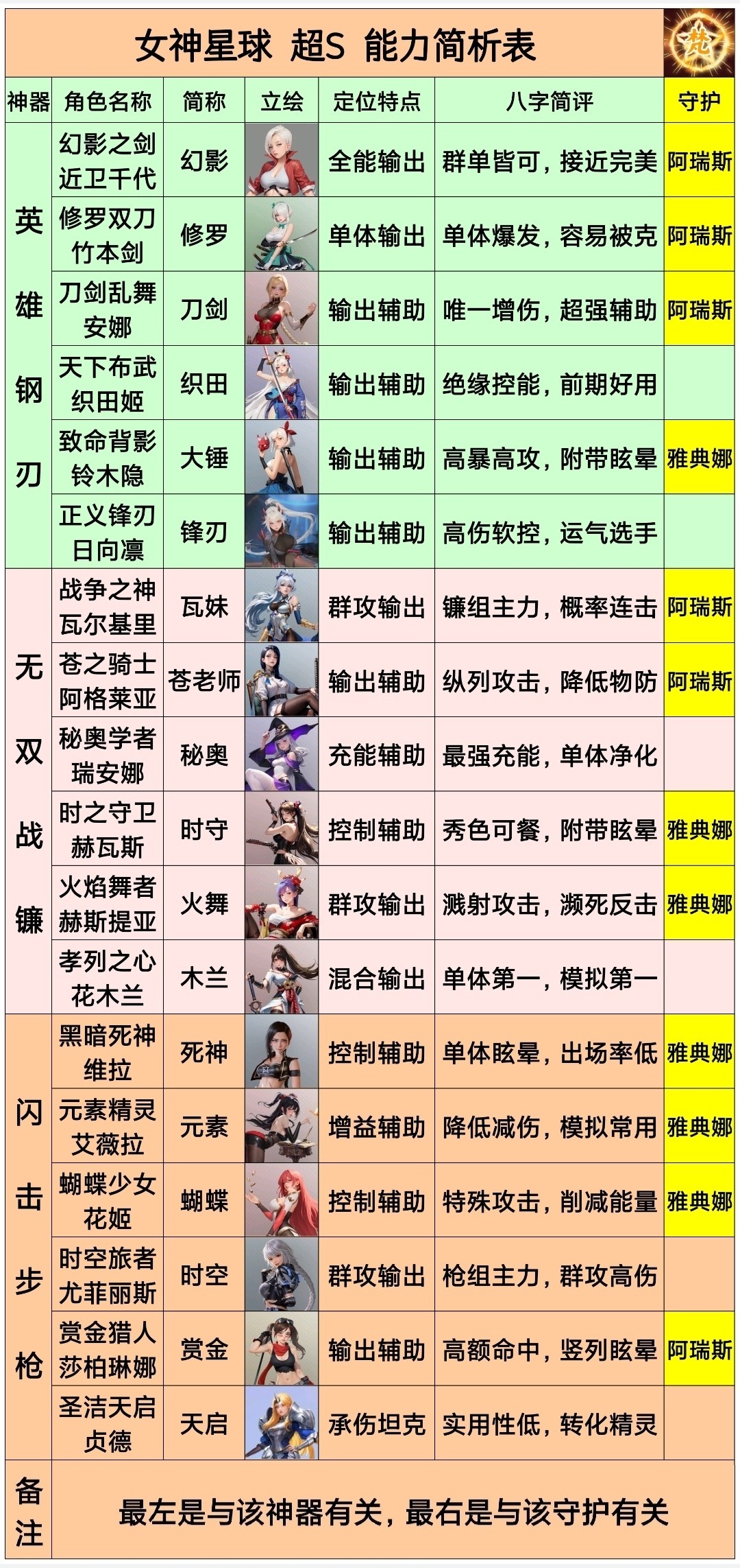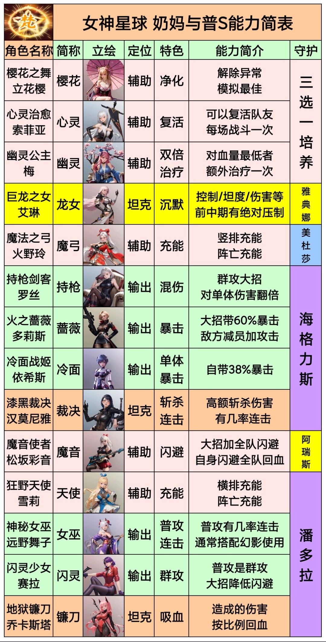 ① 普通S级角色(简称“普S”):基础高稀有度女神,具备完整技能与成长路径。