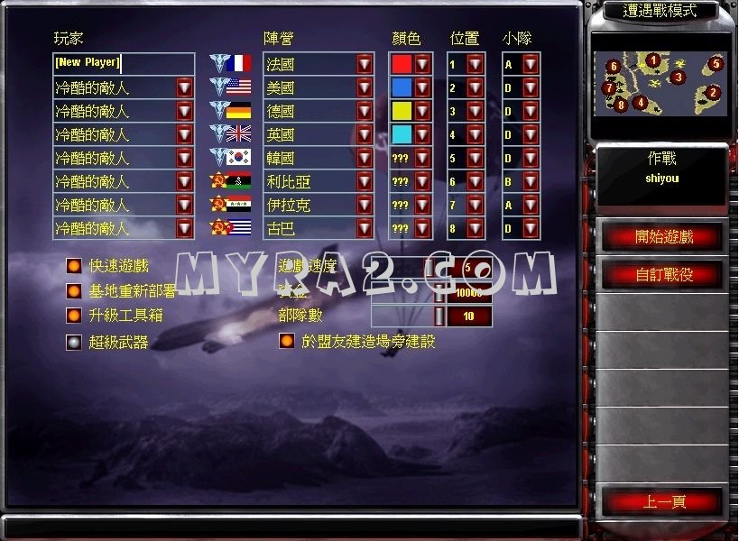 4、将shiyan.yrm、ra2md.ini和Rulesmd.ini拷贝到尤里复仇安装文件夹,遭遇战选shiyou地图,即可游戏。