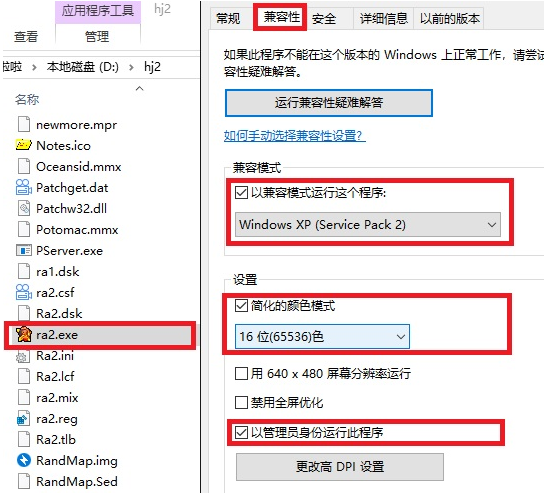 右击游戏目录的【ra2.exe】或桌面的快捷启动方式,选择【属性】,在弹出的属性界面选择【兼容性】,勾选【以兼容模式运行这个程序】,然后选择【Windows XP】,再勾选【简化的颜色模式】,选择【16位色】,最后勾选【以管理身份运行】。